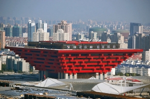 "Mo-dern". Kemodernan Cina diwakili oleh bentuk arsitektur atap paviliun yang bertrap-trap semakin lebar kebawah.